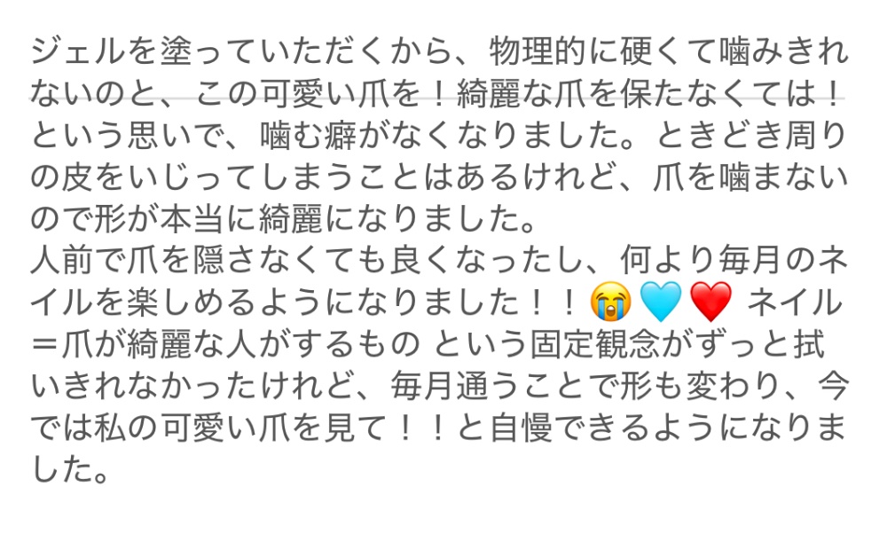 爪の変化も、お気持ちの変化も一緒に喜べるのが幸せです😍1人で悩まず、ぜひ一度ご相談くださいね😊